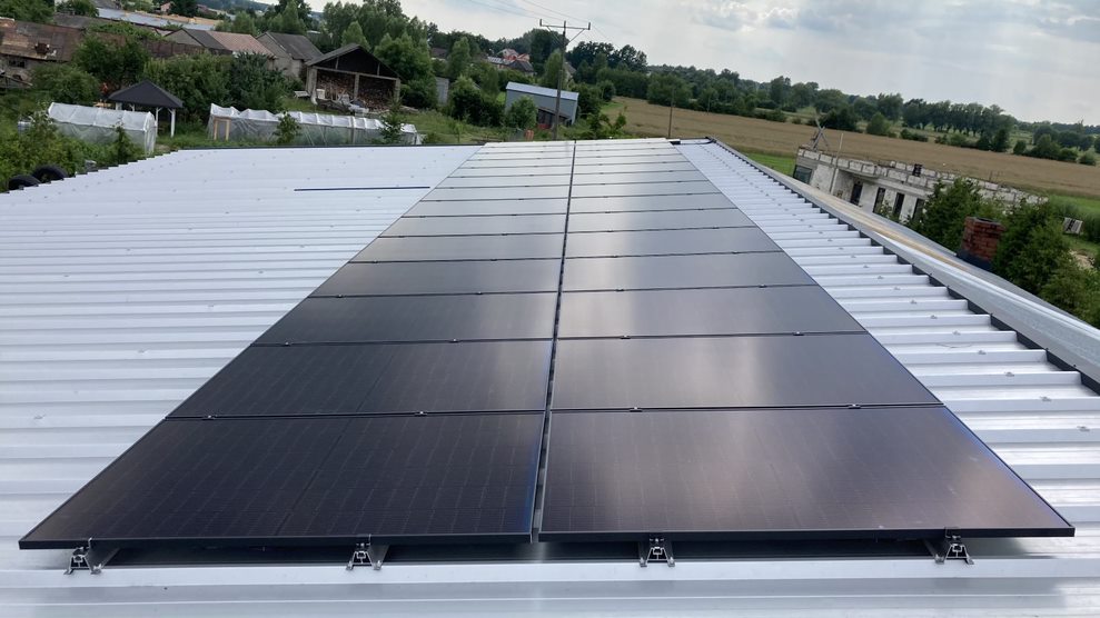 Instalacja zlokalizowana na dachu budynku gospodarczego o mocy 9,38 kWp. Składa się z paneli Qcels mocowanych do dachu na systemowym rozwianiu CORAB dla dachów pokrytych blachą trapezową oraz falownika SMA.